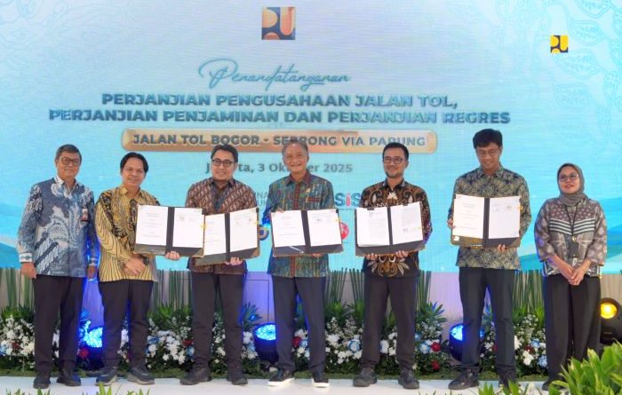 Tangerangplus.com – Kementerian Pekerjaan Umum (PU) bersama Badan Usaha Jalan Tol (BUJT) PT Bogor Serpong Infra Selaras (BSIS) dan PT Penjamin Infrastruktur Indonesia (PII) secara resmi menandatangani Perjanjian Pengusahaan Jalan Tol (PPJT), Perjanjian Penjaminan, dan Perjanjian Regres untuk Jalan Tol Bogor–Serpong via Parung, Jumat (3/10/2025). Kegiatan ini menegaskan komitmen Kementerian PU dalam memperkuat jaringan konektivitas antarkawasan sekaligus membuka peluang investasi dan pertumbuhan ekonomi baru yang selaras dengan Asta Cita Presiden Prabowo Subianto.